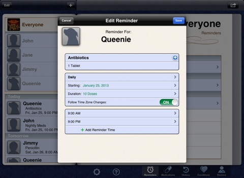 Being a parent means being busy. When your kids are sick, you get even busier. Trying to remember what medications your child is supposed to have, and when, can be a challenge. Remembering the last time you gave your child something can be even harder. Family MedTrack can help by sending you reminders when its time for medications, and tracking which ones you gave, and when. With just a few simple steps, you can enter in medications for multiple people - children, adults, even pets! When its time for a dose, you will get a reminder on your iPhone, iPad or iPod touch. With a tap, you can indicate that the dose has been given. You can even print out or e-mail a reminder checklist or history for school, the babysitter, grandma or a doctor. Family MedTrack will also allow you to keep important information handy for each member of your family. You can keep your doctors phone number, along with allergy information, together in one place, in case of an emergency.