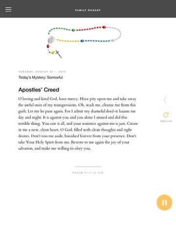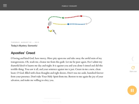 The audio and written prayers are stuck on the apostles creed while the rosary progresses and the beads turn colorful. I really hope this is fixed soon.