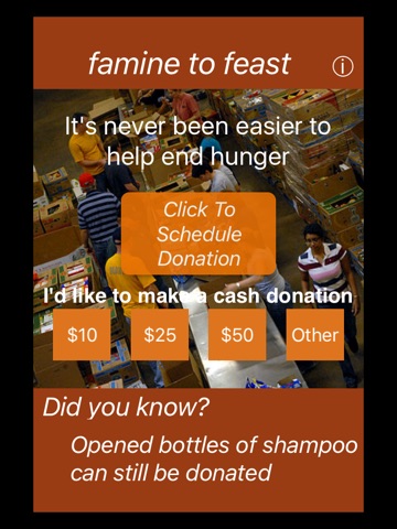Famine to Feast connects people who have extra food with the people who need it right now. Using the simple app, users can find out where to drop off their donation. We can even arrange to have a driver pick up the food in certain early testing areas.
