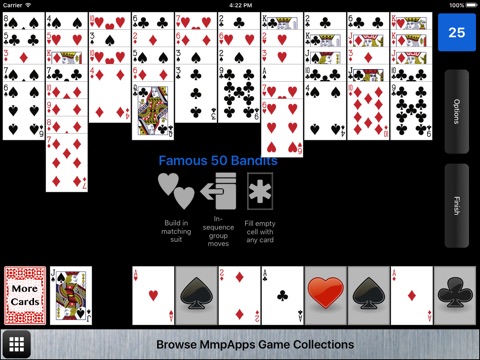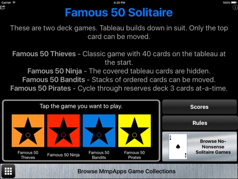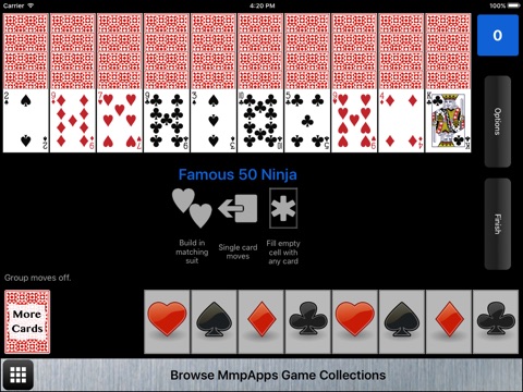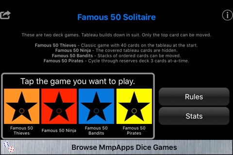 Famous 50 is a classic two deck solitaire game along with three variants. Famous 50 is based on Forty Thieves but with a 10x5 instead of 10x4 tableau. If you love Forty Thieves you will want to try this game.