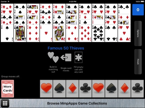 FAMOUS 50 THIEVES - The classic game. You get one pass through the reserve pile one card at-a-time.