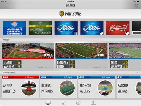 Fan Zone is the ultimate real-time, social sports game. Earn rewards for doing what you’re already doing - watching live sports. Compete with friends and other fans of baseball, football, hockey, basketball and UFC.