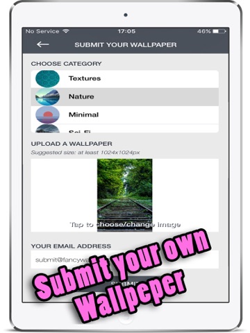 The best thing about our app is that you can submit you own wallpapers. Its very easy just take a photo with the camera or if you have a cool picture just tap on SUBMIT YOURS button, choose the category and picture and press submit, we will review and approve so that the world can use your unique photo as a wallpaper.
