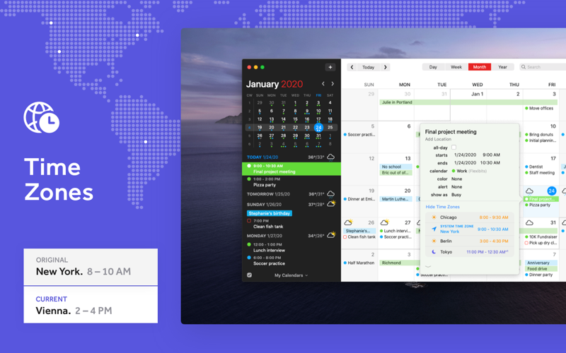 Belle interface. Synchronisse bien avec Google et iPhone (par Google Agenda). Les rappels sont bien implémentés, simple à utiliser. Suggestion dinterface : CMD+Zero nest pas facile à taper en français sans clavier numérique (Macbook, iMac) Mettre un bouton sur le calendrier mini et maxi au même endroit, por passser de lun à lautre, ou une autre astuce simple et symétrique. Merci