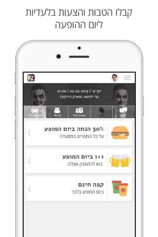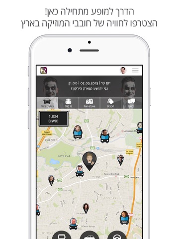 אפליקציית FanZone Events היא החוויה האולטימטיבית לבליינים בישראל - שירות חברתי ופלטפורמה לשיתוף נסיעות המאפשרת לך לראות מי מהחברה בא להופעה, למצוא סידור נסיעה נוח במחיר משתלם ולקבל הטבות מיוחדות ביום המופע.