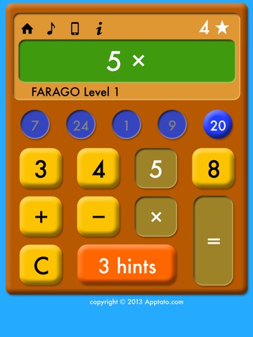 Level 3 (upgrade): You must use all 4 numbers! Earn stars three times faster. This will tax your brain to figure out how to use the same 4 numbers to produce 5 different answers.