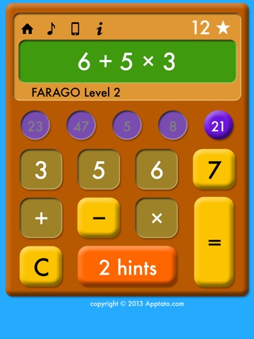 At each stage, you are given 4 numbers from 2 to 9, and 5 answers that you must reach using any of the 4 numbers, and the operations add,subtract, and multiply. (+, -, and x). Earn stars when you get each answer, and more when you finish each stage. To arrive at each answer, you can only use each number and operation once. This is quite challenging, as you have to form 5 products using only the same 4 numbers.