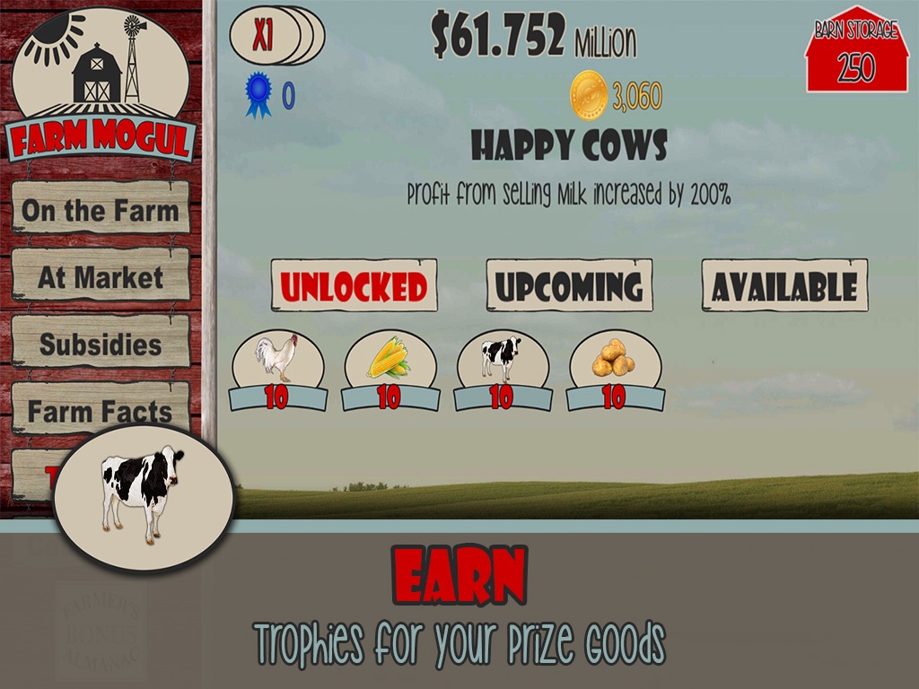 In Farm Mogul you can plant crops and raise livestock. Sell you goods at market and watch your profits sore. Take advantage of valuable subsidies, earn trophies, and win blue ribbons at the County Fair.