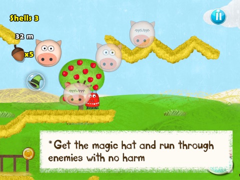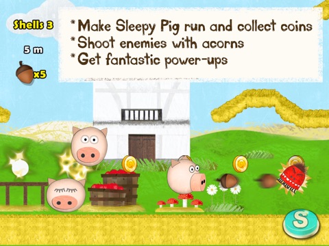 There is a big competition in Mr Smiths farm. Lep, the bubble-like pig, need to run as long as he can by the hay road to win the special prize. Granny Pig and all his family are cheering at him. But he is as a lazy ham, and fall asleep in every step. Help the bubble-pig to run and shoot his enemies with acorns. Get as many coins as you can to buy special gadgets that will help bubble pig in the run.