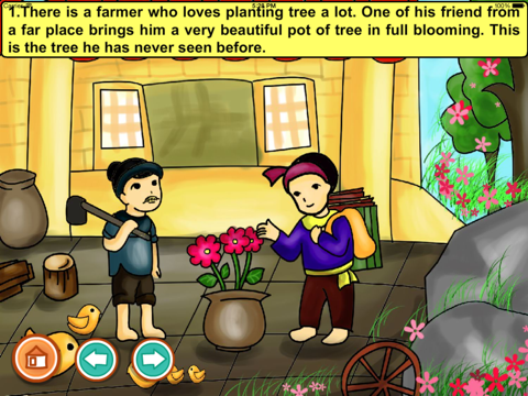 1.There is a farmer who loves planting tree a lot. One of his friend from a far place brings him a very beautiful pot of tree in full blooming. This is the tree he has never seen before.