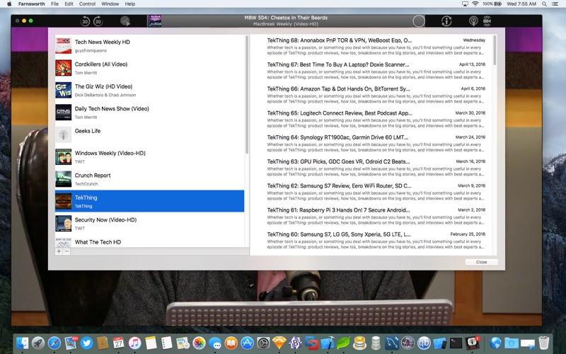 Farnsworth only streams the podcasts. It does not download the podcasts before playing them. This is nice as you can watch podcast episodes immediately and no space is taken up on your computer with downloaded podcast episodes. However, this does mean you have to have an active internet connection to watch the podcasts.