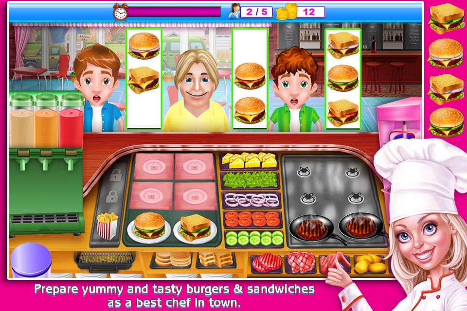 This game is for both kind of audience the fast food lovers and the organic food maker experts. In this time management cooking game you will be playing a role of a fast food master cooking chef and will be involved in cooking so many mouthwatering food items like sandwiches, burgers with cheese & french fries, hot and spicy nuggets, chicken roast & other barbecue items.