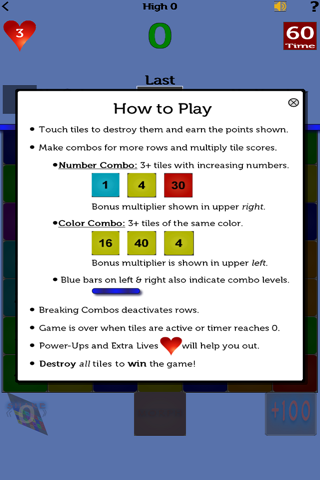Destroy the tiles as fast as you can. Get bonus to reveal more tiles. 3 or more same color gets bonus. 3 or more tiles with successively higher numbers gets bonus. Clear them all to win!