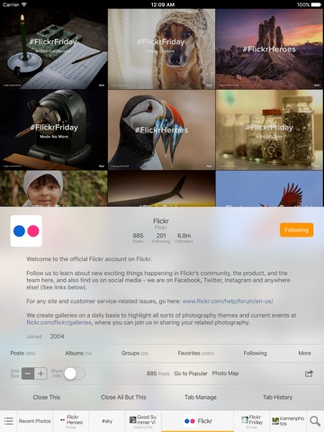 The most powerful way of browsing beautiful Flickr photos: Do you ever need better browser for Flickr photo? Bookmark or quick access to your favorite users and groups? Need a custom grouping? This apps multi-tab feature will be a definitive answer for your Flickr experience.