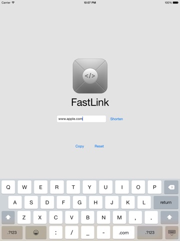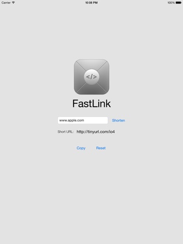 Use FastLink to shorten any URL. Simply type in a URL, tap the "Shorten" button, and you will be provided a new, shortened URL which you can now copy/paste to Twitter, SMS, or an email. Links are shortened via tinyURL.