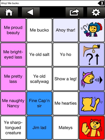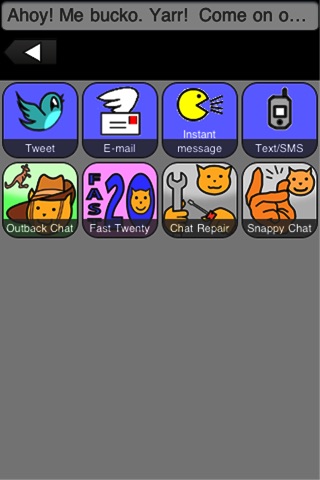 A real voice gets the arrs just right – and you can send yer talk as text via IM, email, SMS text, or Twitter. The unique, patent-pending interface provides up to 160 phrases at the tip of your fingers for brisk repartee – almost faster than ye could speak it yerself.