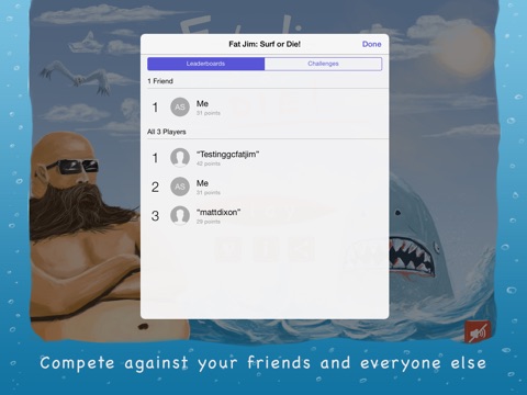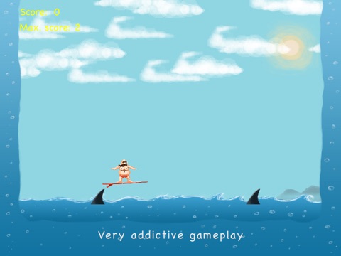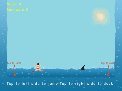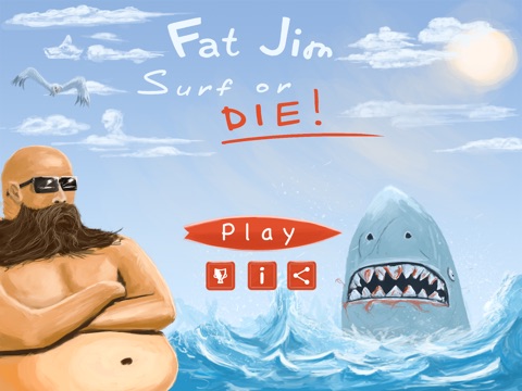 Fat Jim is going to surf in dangerous waters. Help Fat Jim to avoid swimming, blood-thirsty sharks and flying birds by tapping on the devices screen to jump or duck.