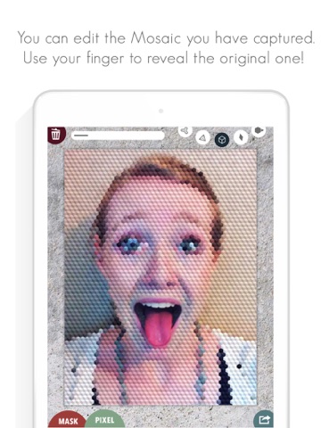 The size of the mosaic tiles can be adjusted interactively; simply pinch the screen! Using a thin pixel size, details will be shown while you can create some artsy censored-like images using really chubby pixels.