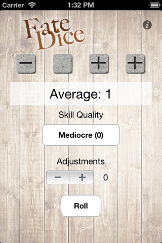 Dice Roll for Fate Core by Evil Hat Productions. Rolls 4 Fate dice, and adds up the total. Allows you to put in a skill quality and adjustment from aspects or stunts.