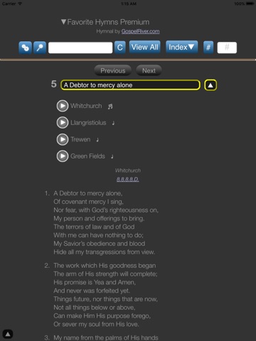 This app contains 11 hymnals containing lyrics to 1400+ hymns and Christian songs (along with some audio). The audio does not include the lyrics.