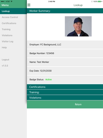 The FC Jobsite App, provided by FCA, allows owners, insurers, contractors and employers real-time access to information regarding workers that have been assigned to projects under their purview. This information is accessed by scanning the bar code or entering the badge number located on the workers RFID enabled photo badge which is carried by any worker who has earned access to the job site through contract mandated screening procedures. The worker information that is available includes a photo of the worker, workers first name, last name, employer, WorkerCheck badge number, badge expiration date and badge status.