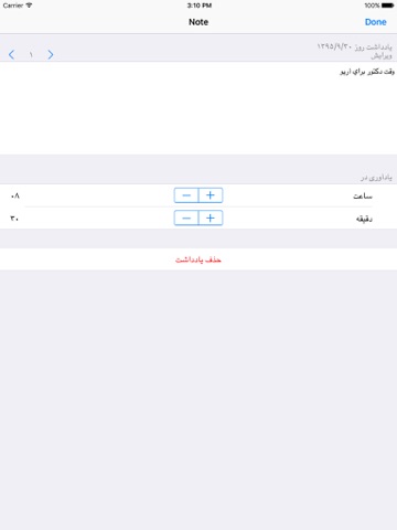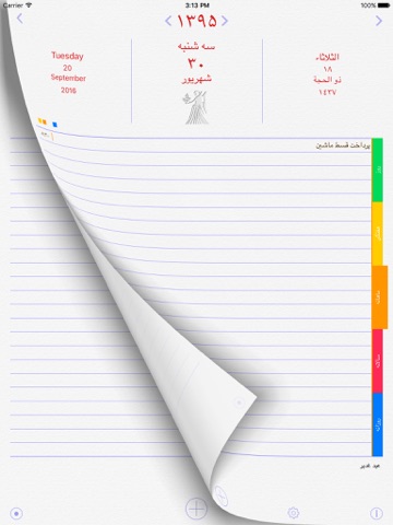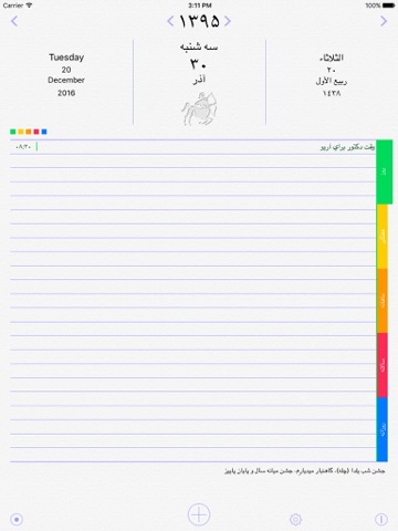 - امکان نوشتن یادداشتهای روزانه، هفتگی (مانند برنامه هفتگی کلاسی)، ماهیانه (مانند سررسید اقساط ماهیانه)، سالیانه (مانند روزهای تولد، سالگرد ازدواج …) و یادداشت کلی (که همیشه تکرار می شود).