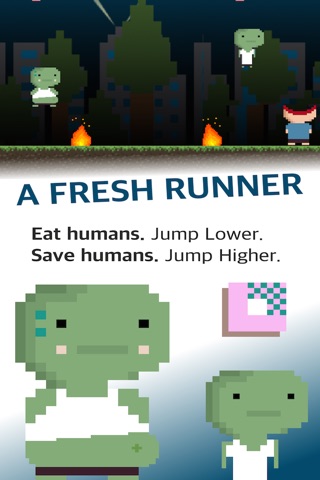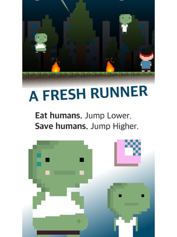 Carls appetite for humans has been a problem. If he eats too many, he gets chunky and can’t jump very high. If he avoids them he can jump higher and further. But he needs to collect those sweet, sweet brainz to get more points, costumes and insta-followers. #zombieproblemz.