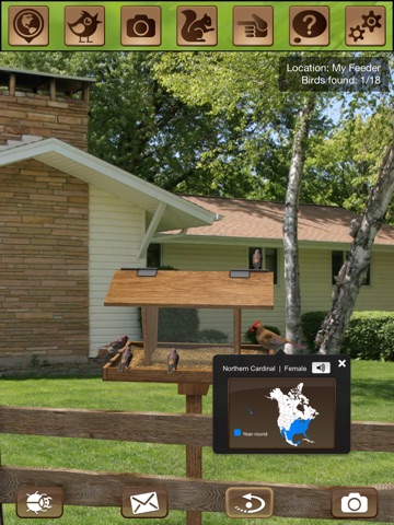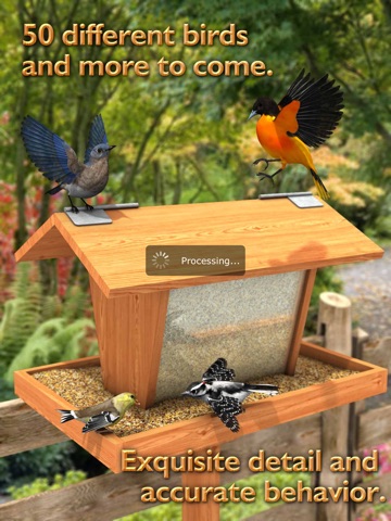 FeederVu is the first realistic 3D virtual bird feeder in the app store. Experience the beauty, fun and serenity of a bird feeder right in your own hands. Attention to detail and scenic backgrounds - gardens, fields, water and others. Guess bird species with clues about shape, song and habitat. Has all the favorite birds - cardinals, warblers, finches, etc.. Discover new birds by adding bird feeders in different locations within the US. Many different bird species and more to come. Take snapshots of the birds and share with other birding enthusiasts. FeederVu is educational, relaxing and unique - enjoy!