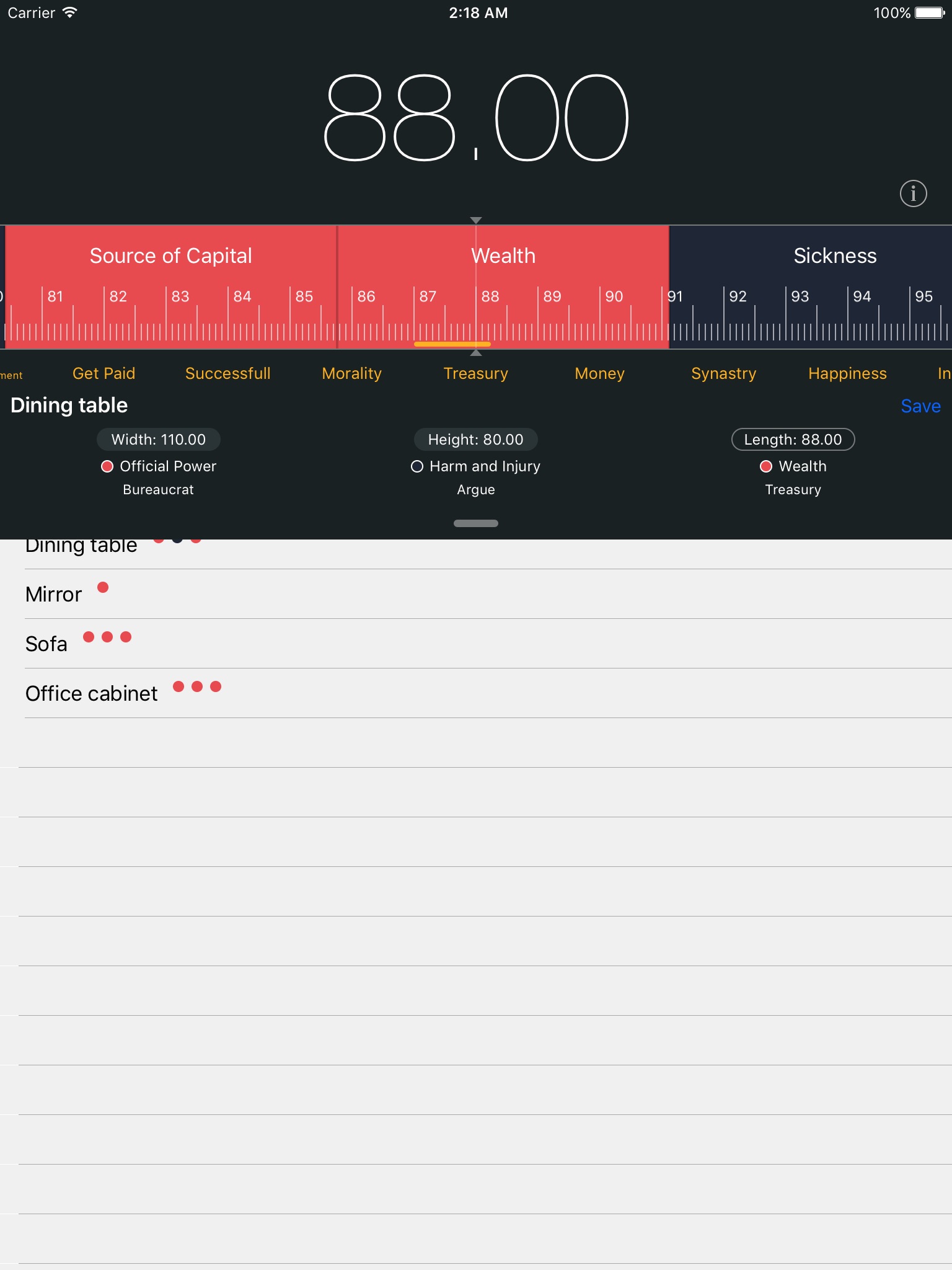 Feng Shui Ruler is a measuring tape app that helps you wisely select the right measurements when designing or buying furniture. It will tell you what kind of energy, whether good or bad, each measure carries. According to Thuoc Lo Ban, measure can carry energy of Wealth, Sickness, Separation, Integrity, Power, Catastrophe, Harm or Profit.