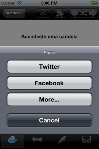 The app "Fernando Pessoa Popular" is a collection of the four line stanzas of popular pattern the Portuguese poet Fernando Pessoa wrote under his real name and that are now public domain. The user may choose Font, Font Size, color, and mark as favorite the ones he/she likes the most in order to get a faster access or read them randomly. The app has 327 four line stanzas.