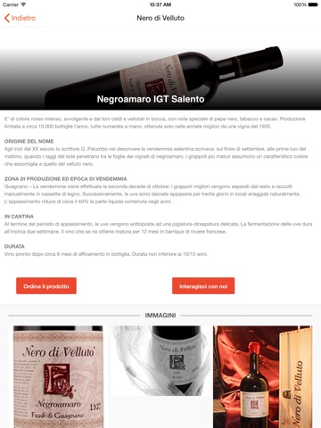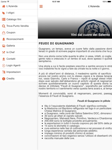 Benvenuti nell’App Mobile dei Feudi di Guagnano. Attraverso la nostra App Mobile potrete visionare le schede dei Vini suddivise per tipologia di vitigno, richiedere informazioni, effettuare un ordine, visualizzare e raggiungere su mappa gli Store o i punti vendita dove poter acquistare oppure degustare i vini dei Feudi di Guagnano. Potrete ricevere direttamente sul vostro smartphone, tramite notifica, Coupon e Promozioni da spendere nei nostri punti vendita certificati. Uno strumento indispensabile per gli Agenti certificati attraverso cui poter inviare direttamente a Feudi di Guagnano gli ordini di acquisto.