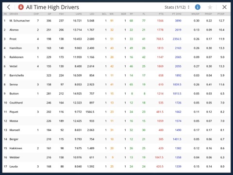 Lots of numbers, stats and totals for all drivers and teams, sorted to your liking.