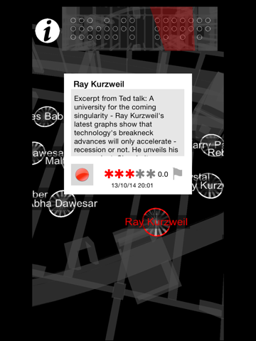 This app features a 3D view of Information Age gallery that rotates and turns with your device as you walk around. In this ‘live’ view you will see all 40 light beacons and hear a murmur of all the voice recordings that are stored in them.