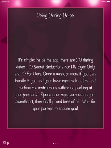 Includes foolproof seduction tips and a list of ingredients (scarf, massage oil, shades etc). And because its all a secret, theres never been a more effective way to build anticipation and rekindle passion. Whats more, youll actually turn interesting, exhilarating, unpredictable evenings into a habit, and not just a special event.