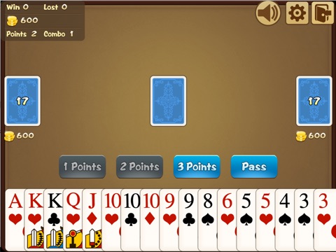 The bidding round establishes the player who will become the landlord.The first bidder is decided by a pre-bidding round, where each player is dealt a card. The one who is dealt the “wild card” begins the bidding.In the bidding round the players can pass, or bid one, two or three points. Every player must bid more than the previous player, or pass. If all players pass, the cards are dealt again. The player who bids the most, wins the bidding round, takes the three cards from the center and becomes the landlord. If a player bids three points, he wins the bidding round immediately. If all players pass, then the cards are dealt again and a new bidding round starts.