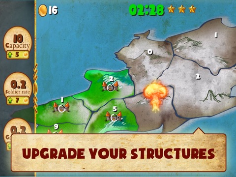 You will have small parts of territory and you should conquer all the kingdom and do it as soon as possible. You can upgrade your castles to keep more units, recruit new soldiers faster or collect gold sooner.
