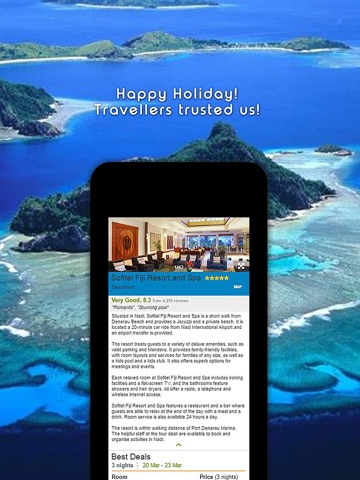 Fiji Hotel Search, Compare Deals & Book With Discount help you to find and compare the best hotel deals from all major travel websites with one quick and easy search. No matter where in the world you are looking, how much is your budget, even at the very last minute, this app will find you the cheapest one to fit your budget and get you the best value for your money.