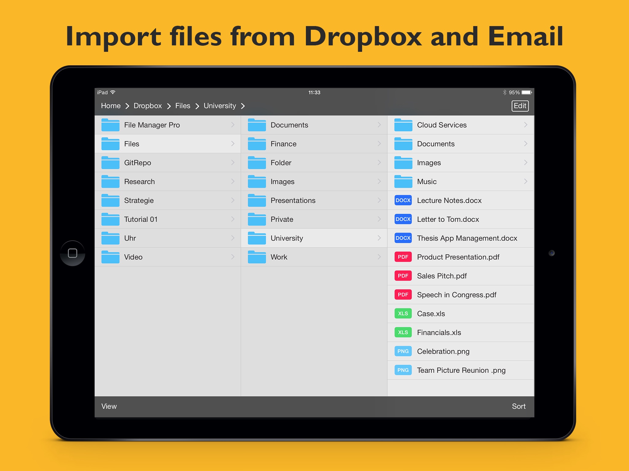 File Manager is a universal app. You can download File Manager for the iPhone and the iPad paying once only. Always have your important files at your fingertips.