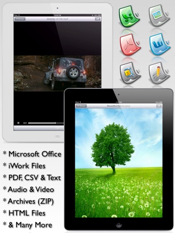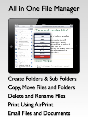 It allows you to create folders, copy, move, view, rename, email, delete, find, search, sort, print, play, transfer wirelessly and view documents, images, audio, videos, archives, iWork files, MS office docs or any other files or folders with ease.