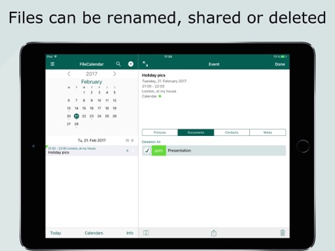 The app accesses your events to store files. Working with files and events is supported by an easy-to-use file manager and a unique search function.