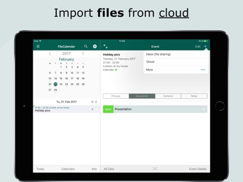 Prepare your professional and private appointments. Create events. Save files, notes, contacts and links to your calendar! Over 20 file formats are supported.