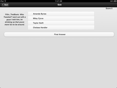 Companion app for the new controversial Twitter Game, Fillin_TheBlank. See who is playing and easily search past tweets. Submit Suggestions and play the Fillin_TheBlank Celebrity Trivia Quiz game