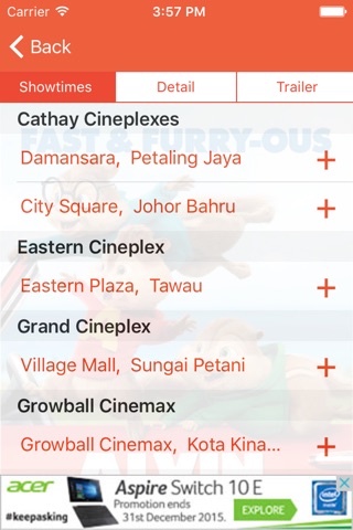 Cinema included : GSC, TGV, MBO, LFS, Star Cineplex, Growball Cineplex, Megalong Cineplex, Eastern Cineplex, Superstar Cinema, Grand Cineplex, Mega, Cineplex, Jitra Mall Cineplex, Premium-X Cinema, One Cinema and other s.