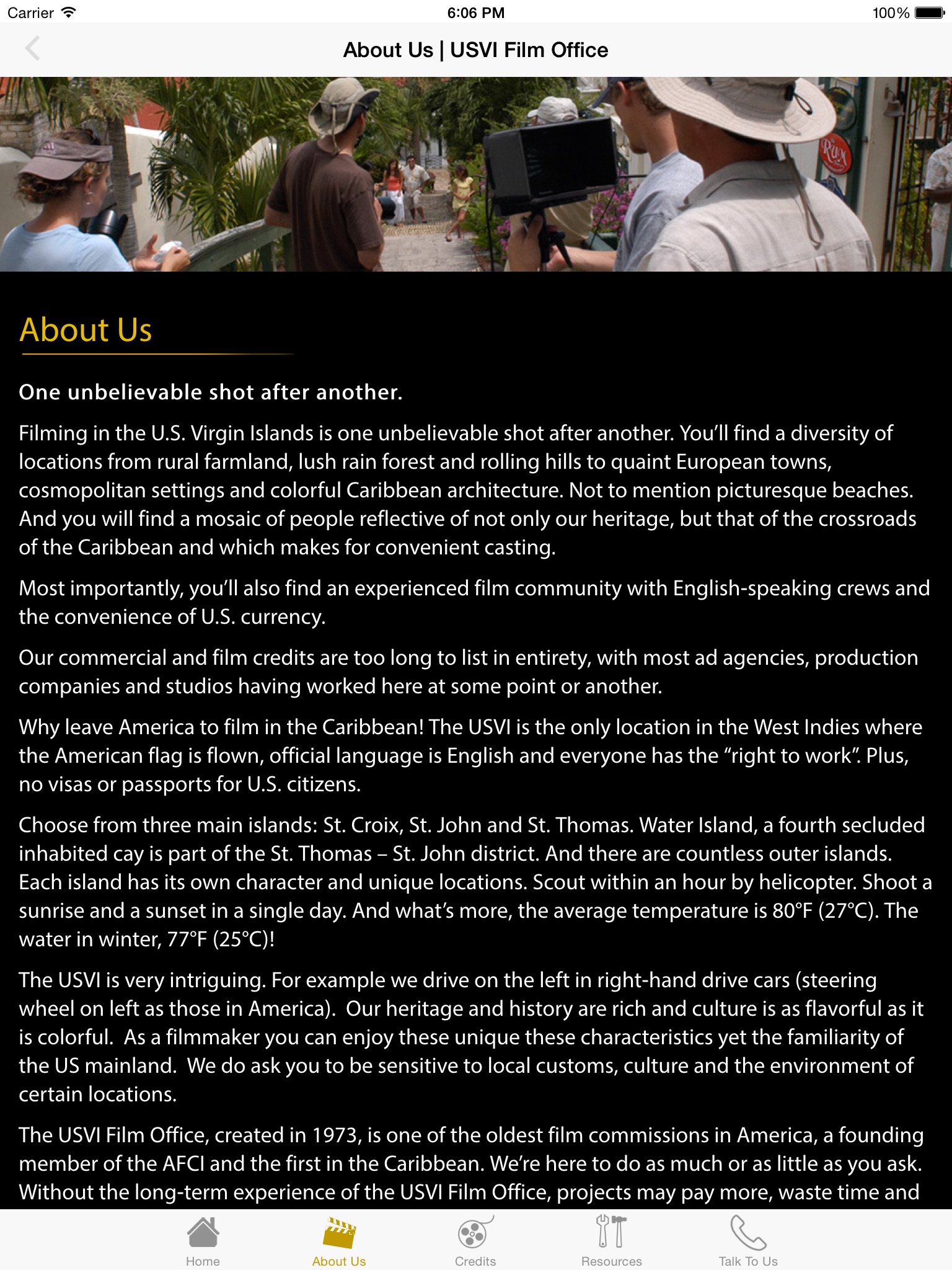 The FilmUSVI app is a convenient on-location production guide to the US Virgin Islands at your finger tips. Browse experienced production resources and un-imaginable hero locations. Learn about our long list of credits and make direct contact to the US Virgin Islands Film Office, the oldest film commission in the Caribbean. Why leave America to film in the Caribbean! Keep FilmUSVI in the palm of your hand.