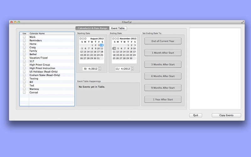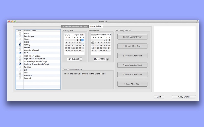 FilterCals intuitive interface (especially in full-screen mode) will help you to select the Events you simply must have, and then either Copy or Move them to a calendar of your choice. You can then hide the source calendar(s) and instantly clean up your display. No more being bombarded with Calendar Items you dont need or want.
