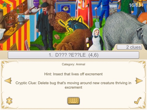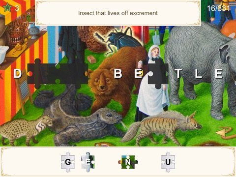 Roll Up! Roll Up! The Filth Fair is Coming to Town! The Filth Fair is a hidden word game based around some amazing artwork. Every object in the beautiful main image can be selected by touch. Once selected you need to guess the word (or words) that describes that object. To help you in this challenge there is a cryptic clued, a simple hint and a jigsaw jumble. You can also earn Wild Stars that reveal some of the hidden letters. Objects in the game have more than one word associated with them, which means in total there are 331 words to find! Can you reveal all of the hidden dirt in the Filth Fair? Medals and a grand trophy await the curious mind that can!