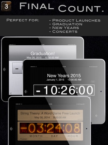 The Ultimate Countdown App! Now in French! Remind yourself of your most important life events using Final Count. Share timers with your friends via email integration, and view them all in beautifully rendered themes!