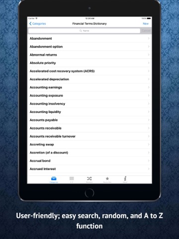 This app is very user-friendly, as it offers an easy search function, a list of all contents from A to Z and a random-feature, which can be useful for students in the field of finance, to run through randomized terms during some spare minutes.