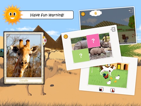 - "Where is ...": only one animal is present in the scenery: the child has to scroll to find it. A "bobble head" type card appears.