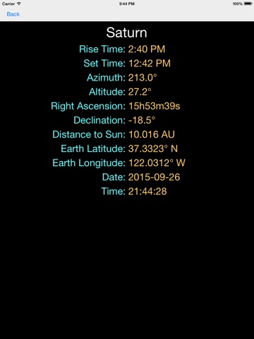 This app will also tell you if the planet is above or below the horizon and by how many degrees. Tap this "horizon" text and the app will display the planets astronomical data, such as its rise and set time.